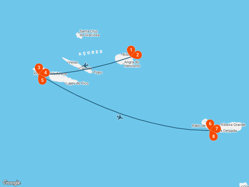 A viagem segue pela costa oeste, com paragem no Miradouro do Pico do Carvão, de onde se avistam simultaneamente as costas norte e sul da ilha. Rodeado por paisagens verdejantes, chega-se ao Miradouro da Vista do Rei, o ponto mais famoso das Sete Cidades, com a vista inesquecível sobre as Lagoas Azul e Verde.